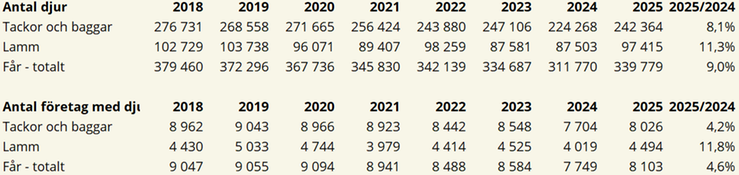 Antalet lamm i december 2025 var drygt 11 % fler än i december 2024 medan antalet tackor och baggar ökade med ca 8 % under samma period.