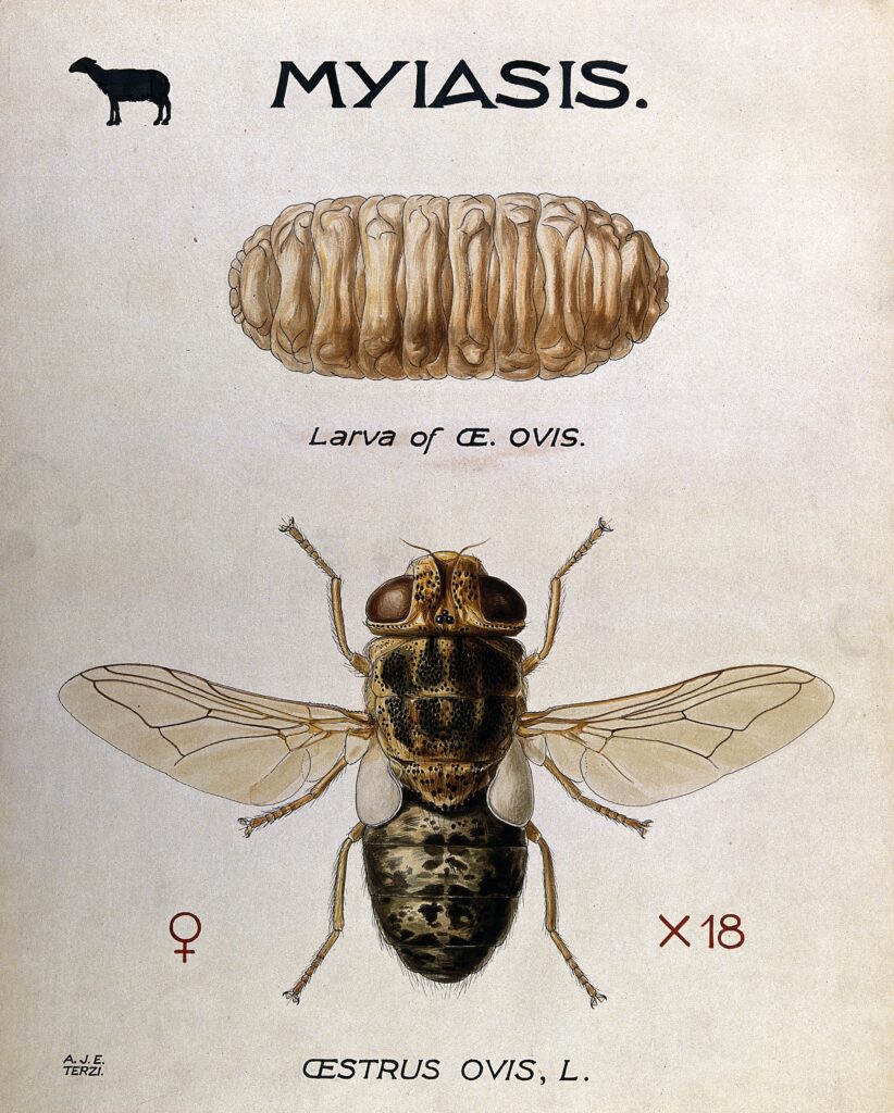 Bild Wikipedia V0022564 The larva and fly of the sheep-nostril-fly (Oestrus ovis). C